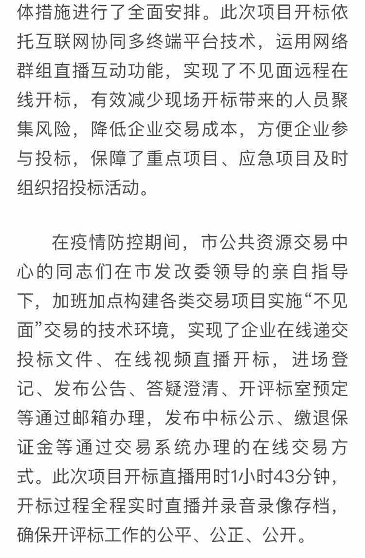 此次招標依托互聯網協同多終端平臺技術,運用網絡群組直播互動功能,實現了“不見面”遠程在線開標,有效避免了人員聚集和交叉感染的風險,同時降低了企業交易成本,方便企業參與投標。是疫情防控以來西安市公共資源交易中心首個恢復項目,在疫情防控的特殊時期,保障了我市重點、民生項目的順利推進,為我市發展電子化“不見面”招投標提供了寶貴的經驗。