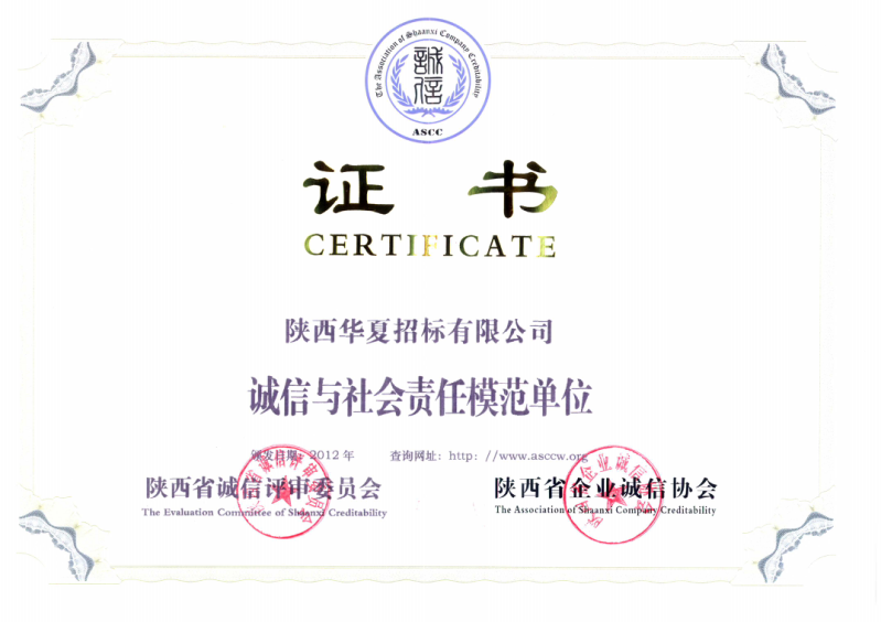 誠信與社會責任模范單位證書